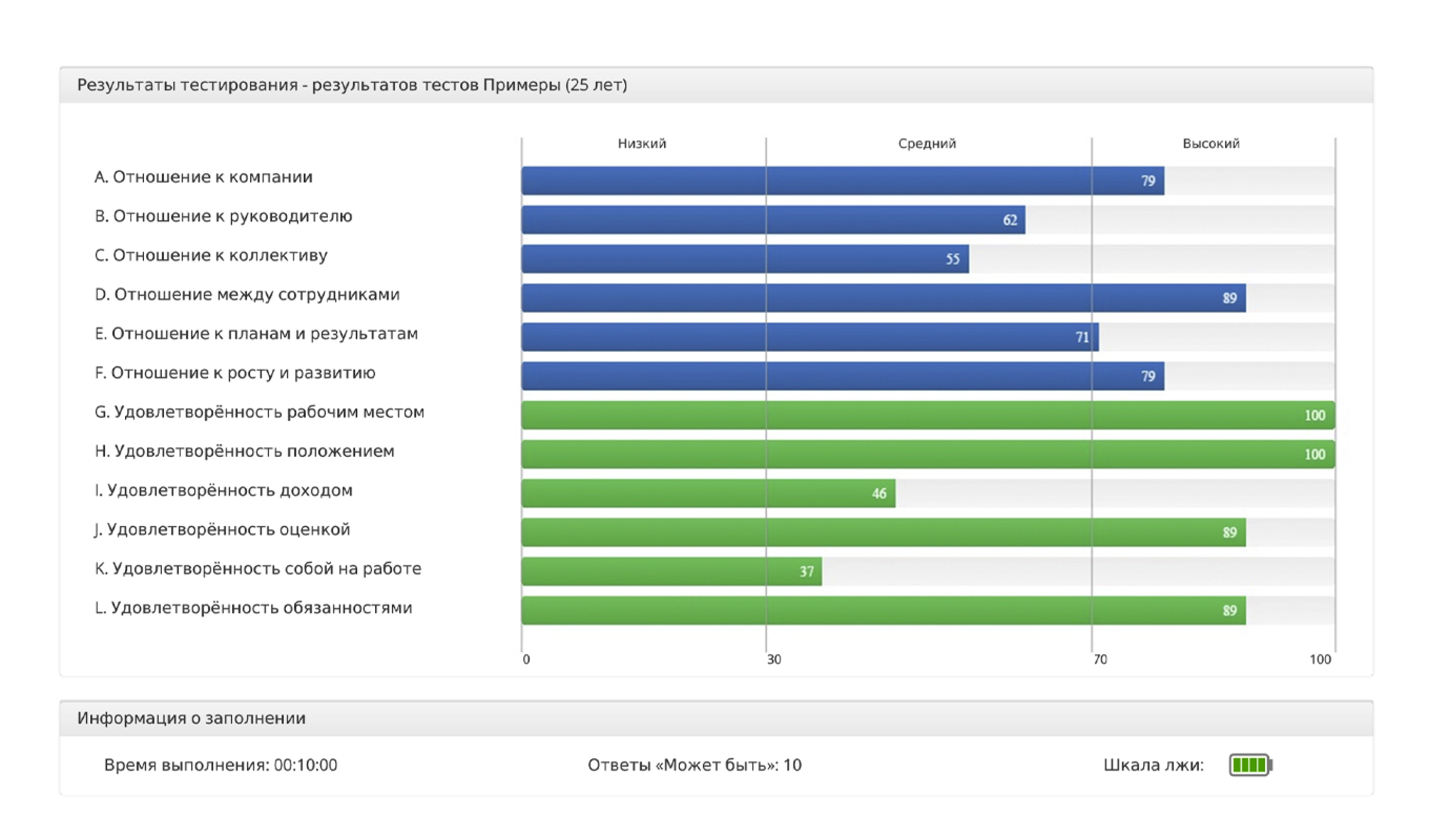 Тестирование можно проводить анонимно или открыто. При этом в сам тест введена специальная шкала лжи в виде батарейки batterybattery battery Это серия специальных вопросов, показывающая насколько сотрудник пытался обмануть тест, давал ли он социально-одобряемые ответы, опасаясь наказания за свою искренность.
