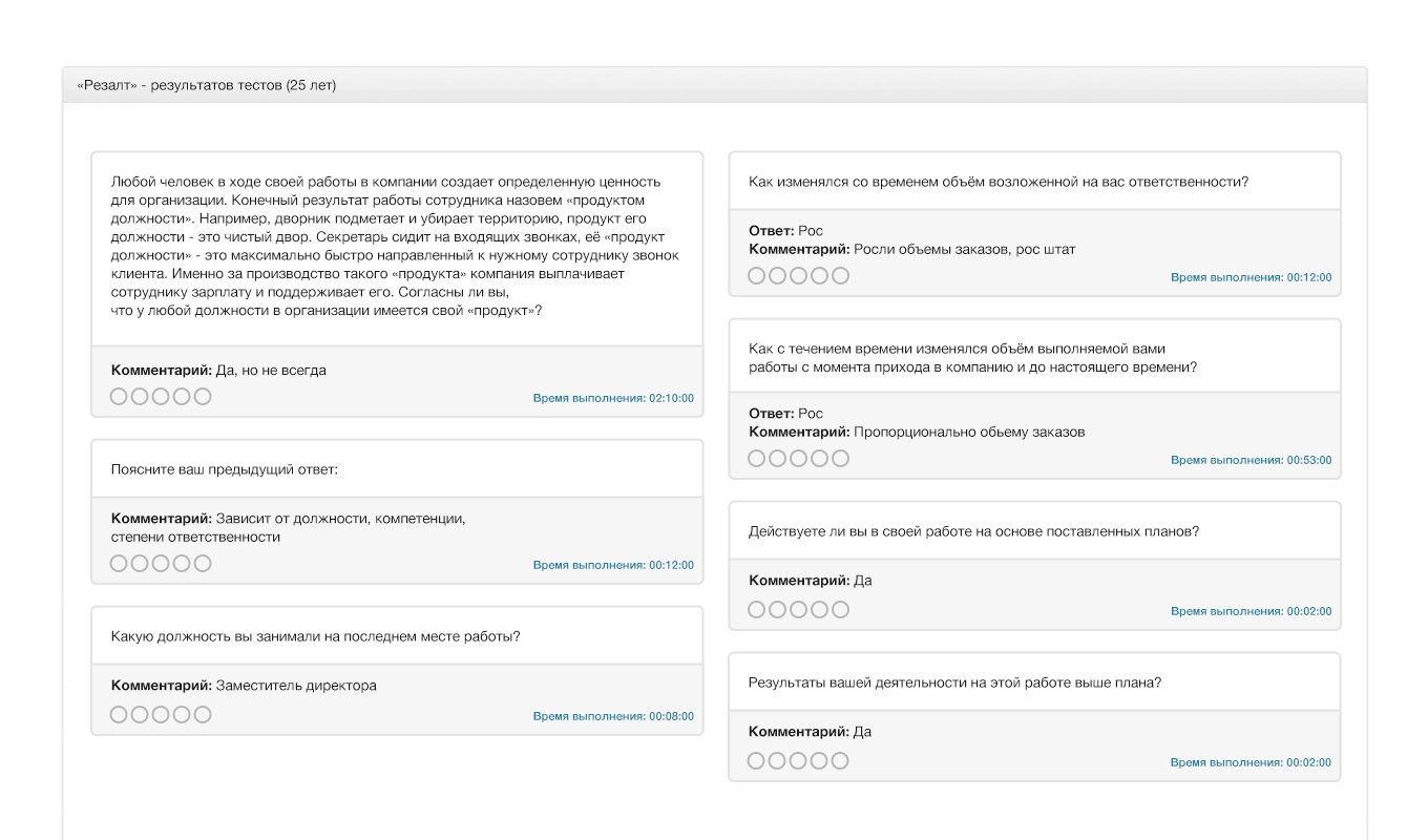 Так отображаются ответы кандидата на вопросы теста «Резалт».