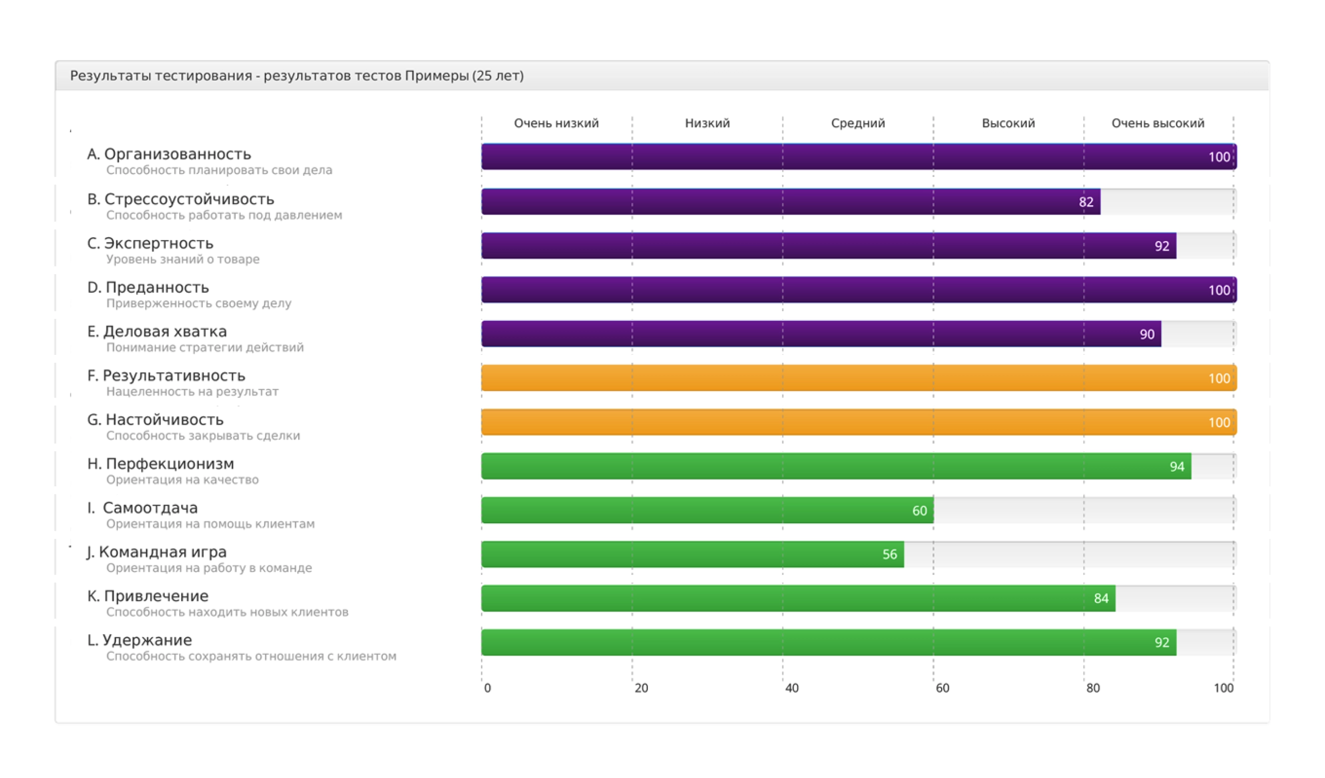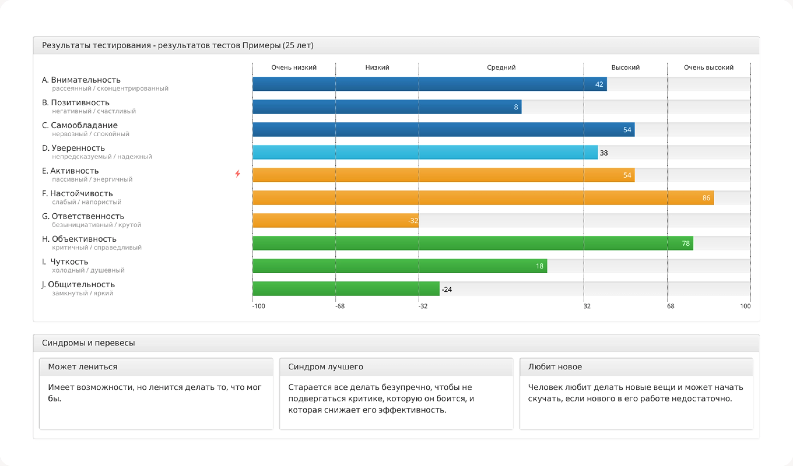 На скриншоте вы видите результаты тестирования кандидата на позицию директора по маркетингу. Мы видим, что его сильными сторонами являются самообладание, настойчивость и объективность, а низкий показатель ответственности говорит о том, что кандидат обладает низкой инициативностью.