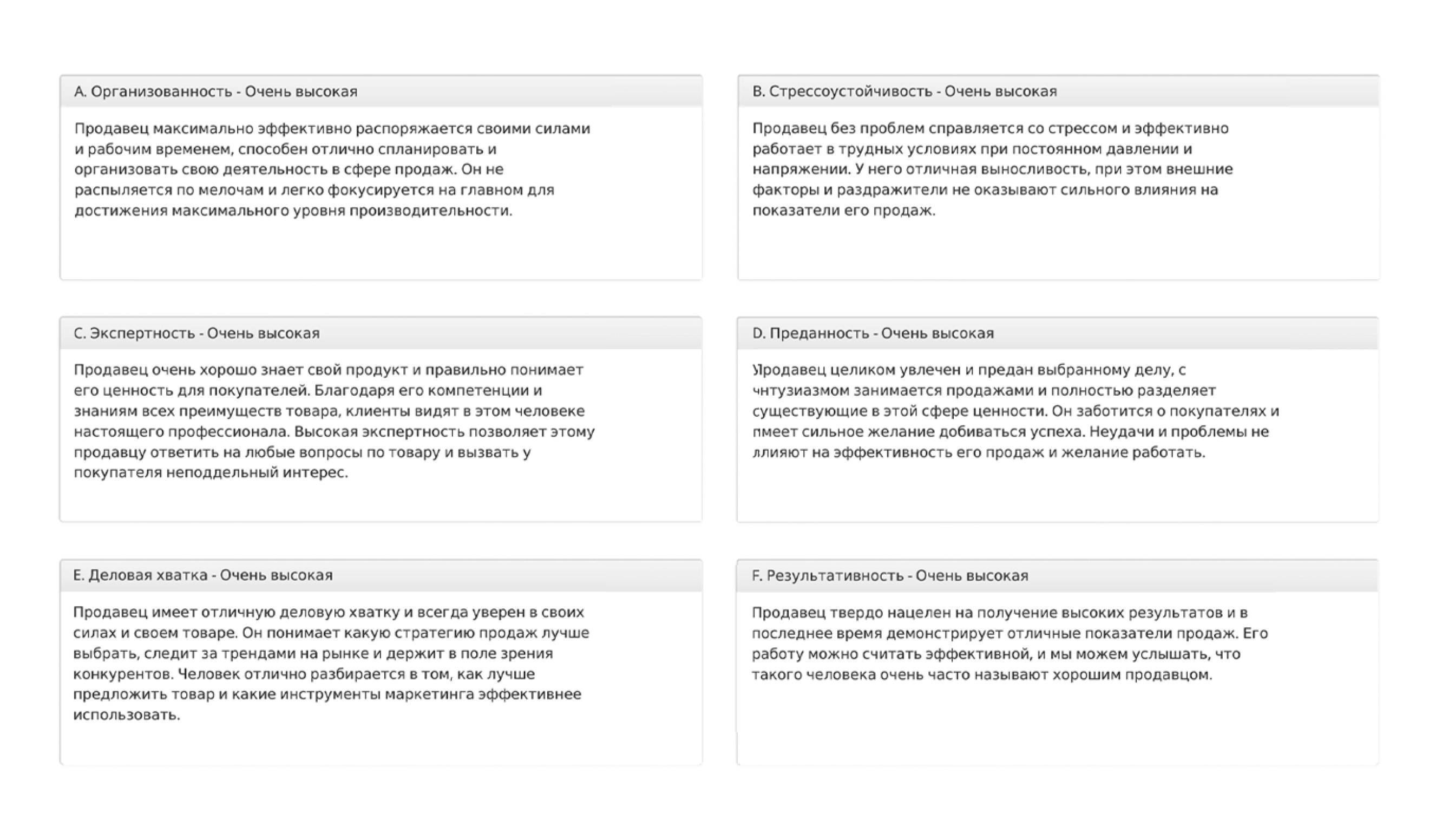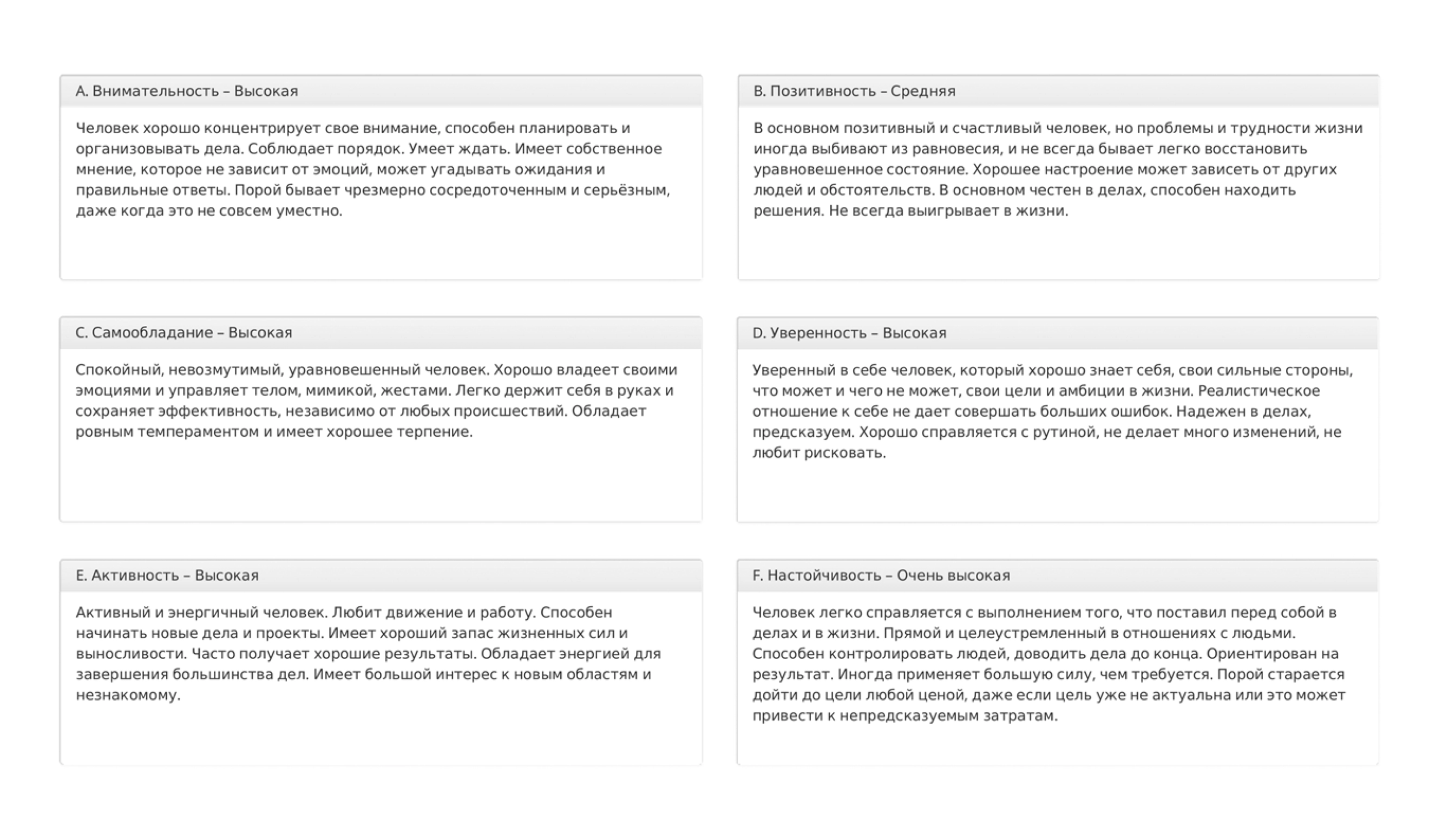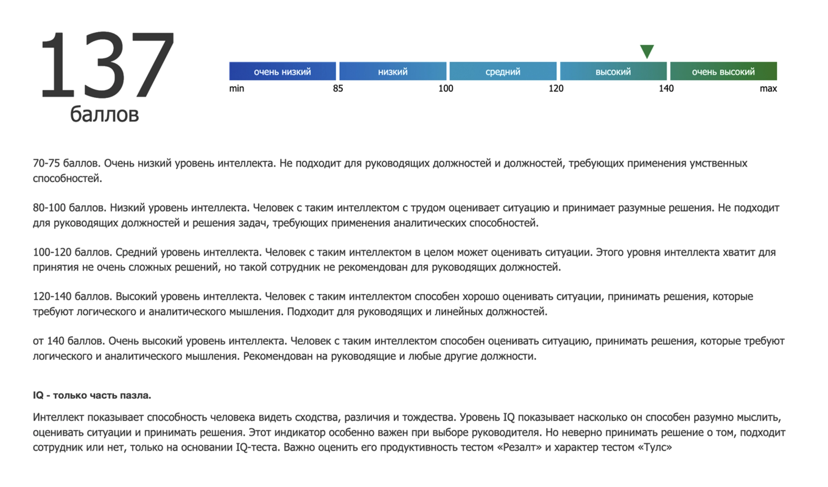 На основании ответов кандидата система автоматически сформирует и отправит вам лаконичный отчет, в котором простым и понятным языком даст оценку по каждому из 10 пунктов. Вам останется лишь принять решение о том, соответствуют ли личные качества кандидата вакантной должности.