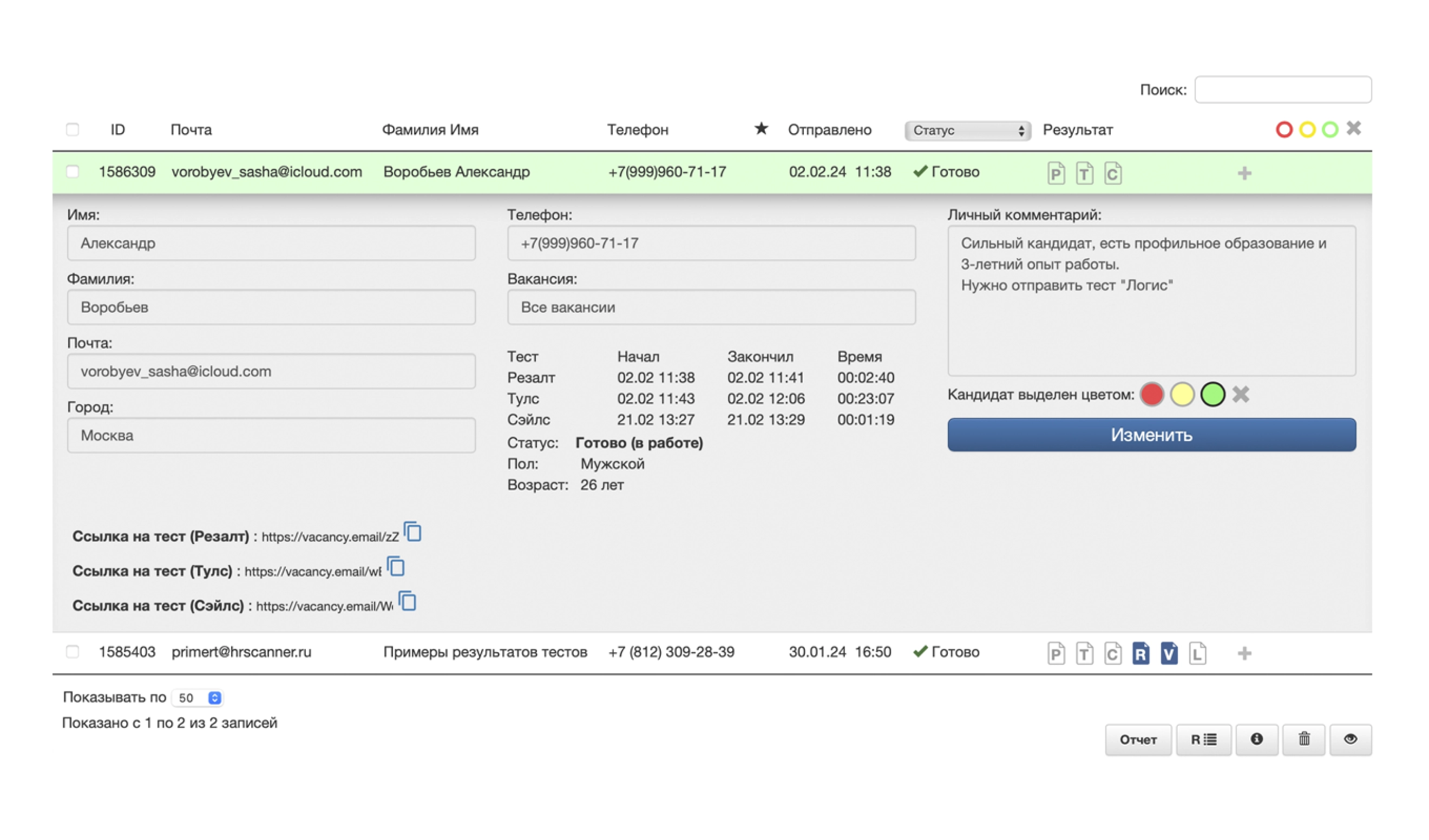 Кандидат получает письмо со ссылкой на второй тест и проходит его за 30-50 минут, а мы сразу получаем результаты его теста в своем кабинете
